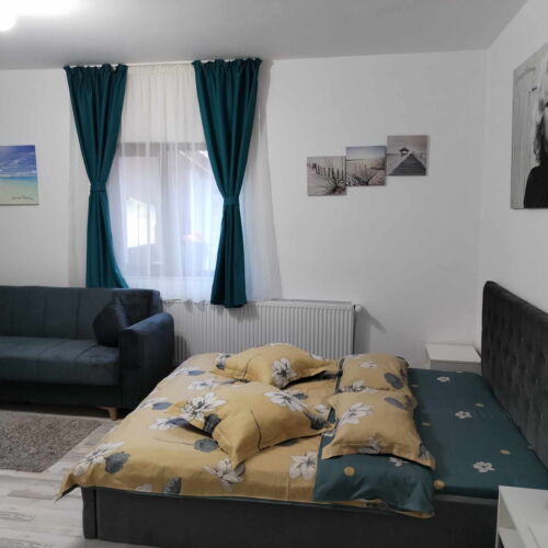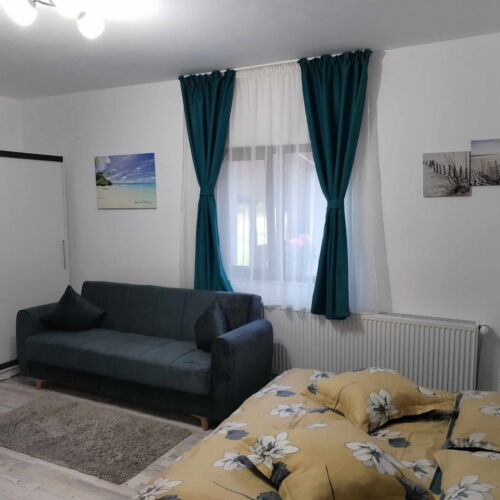 • Camera dublă cu baie proprie: Amenajată modern, ideală pentru confortul a 2 persoane.
